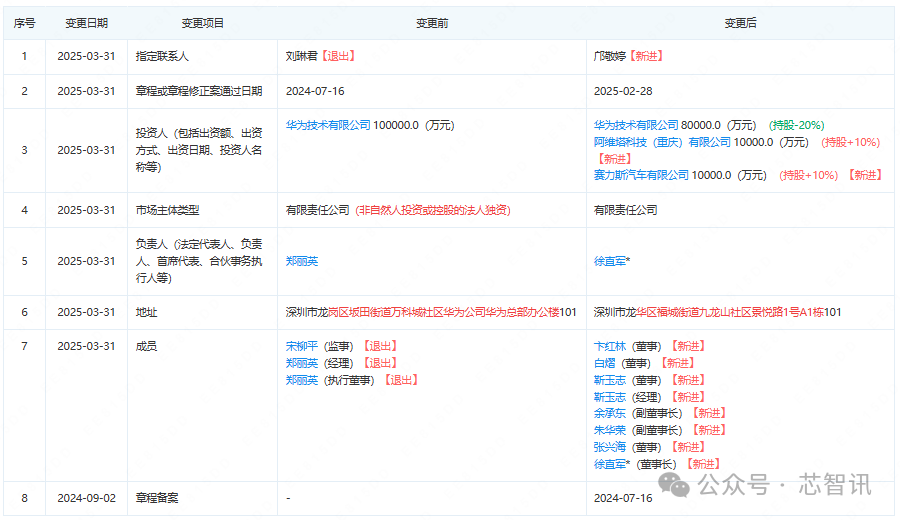 与此同时,引望智能董事会成员也发生了调整,华为徐直军担任引望智能董事长,华为余承东和长安汽车朱华荣担任引望智能副董事长,白熠、靳玉志、卞红林、张兴海任引望智能董事。