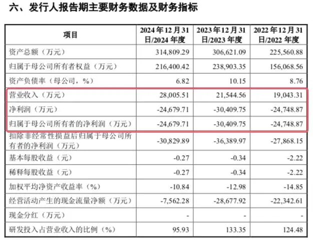 业绩方面,2022-2024年,视涯科技营业收入持续增长,但研发投入也持续加大,报告期各期,公司研发费用占营业收入的比例分别高达124%、133%和96%。同时,公司部分产线处于建设阶段尚未达产、下游行业销售规模效应尚未显现。因此,报告期内,公司归母净利润分别为-2.47亿、-3.04亿和-2.47亿,公司尚未实现盈利且存在累计未弥补亏损。