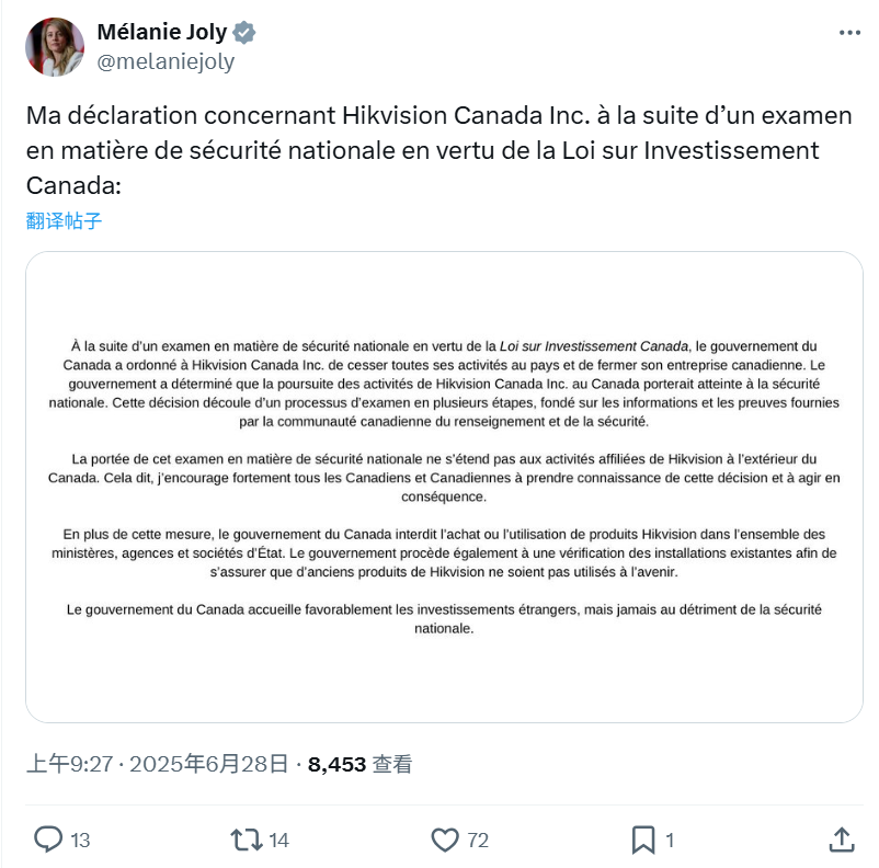 加拿大工业部长梅拉妮·乔利在 X平台上发布声明称,加拿大政府在根据《加拿大投资法》进行审查后认定,海康威视加拿大公司继续在该国运营将 “损害加拿大的国家安全”。其补充说,审查范围并不包括海康威视在加拿大境外的附属业务。政府将禁止政府部门、机构和皇家公司购买或使用海康威视产品。加拿大也将进一步审查现有资产,确保遗留在市场的海康威视产品不会继续被使用。