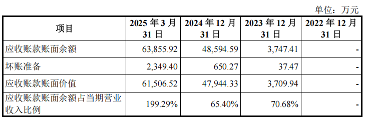 报告期各期末,沐曦股份应收账款账面价值分别为 0 万元、3,709.94 万元、47,944.33 万元和 61,506.52 万元,占各期末流动资产的比例分别为 0%、2.91%、14.00%和 6.13%,占同期营业收入的比例分别为 0%、69.97%、64.52%和 191.96%。