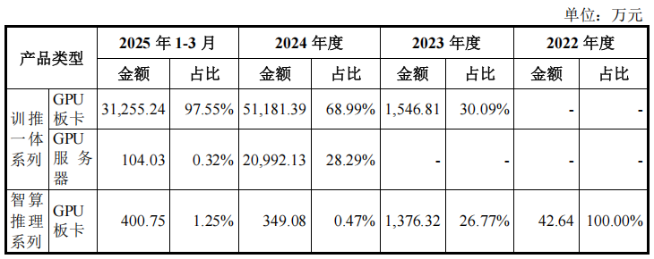 从沐曦股份公布的营收来源看,2023 年度、2024 年度和 2025 年 1-3 月,,沐曦股份的训推一体GPU板卡的销售额占比也是持续快速提高,各期占比分别为30.09%,68.99%和97.55%。这也进一步反应了沐曦股份的营收对于训推一体芯片曦云 C500系列的高度依赖。
