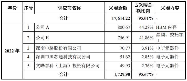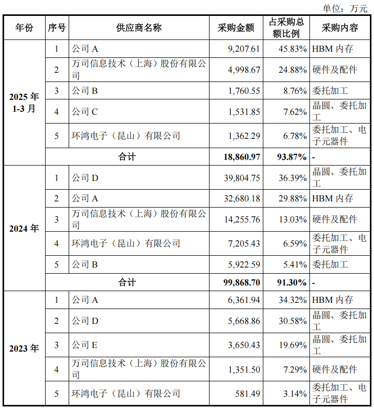 报告期各期,沐曦股份前五大供应商采购金额占当期采购总额的比例为 95.67%、95.01%、91.30%和 93.87%,前五大供应商采购占比相对稳定。其中,公司 D、公司 E、公司 C 为芯片供应商,公司向其采购晶圆及委托加工服务;公司 A 为HBM 内存等产品知名供应商,公司向其采购 HBM 内存,因此公司对上述供应商采购金额相对较高,不属于对单一供应商的依赖情况。报告期内,公司不存在对单一供应商采购比例超过 50%的情况。
