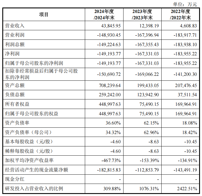 在研发投入方面,2022-2024年度,摩尔线程研发投入分别为111,649.37万元、133,442.57 万元和135,868.90万元,合计研发投入金额 380,960.84 万元;最近3年累计研发投入占最近三年累计营业收入比例高达 626.03%。