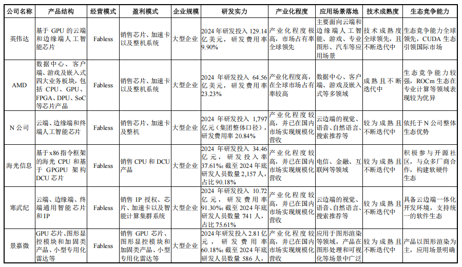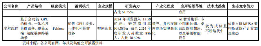 摩尔线程表示,公司在国内 GPU 领域处于领先地位,基于自主研发的 MUSA 架构,公司率先实现了单芯片架构同时支持 AI 计算加速、图形渲染、物理仿真和科学计算、超高清视频编解码的技术突破,有力推动了我国 GPU 产业的自主可控进程。然而,公司与英伟达等国际巨头相比,在综合研发实力、核心技术积累、产品客户生态等方面仍存在一定的差距。