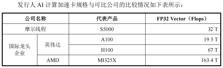虽然有消息称,摩尔线程最新的S5000加速卡可以对标英伟达H100。不过,芯智讯查阅招股书所公布的数据发现,摩尔线程S5000的FP32 Vector算力为32TFlops,超过了英伟达A100,但仍低于H100。