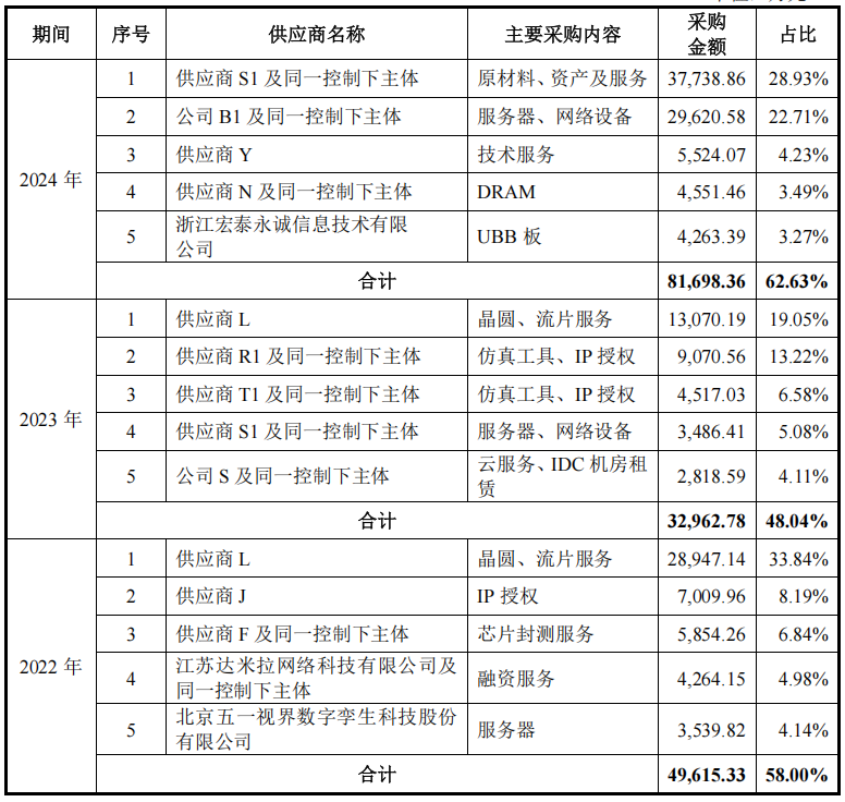 报告期内,摩尔线程向前五名供应商采购的内容主要为晶圆、流片服务、芯片封测服务、IP 授权、仿真工具、服务器及电子设备、技术服务、云服务和 IDC 机房租赁等,合计采购金额占当期采购总额的比例分别为 58.00%、48.04%和 62.63%。但是不存在向单一供应商采购比例超过 50%的情况。