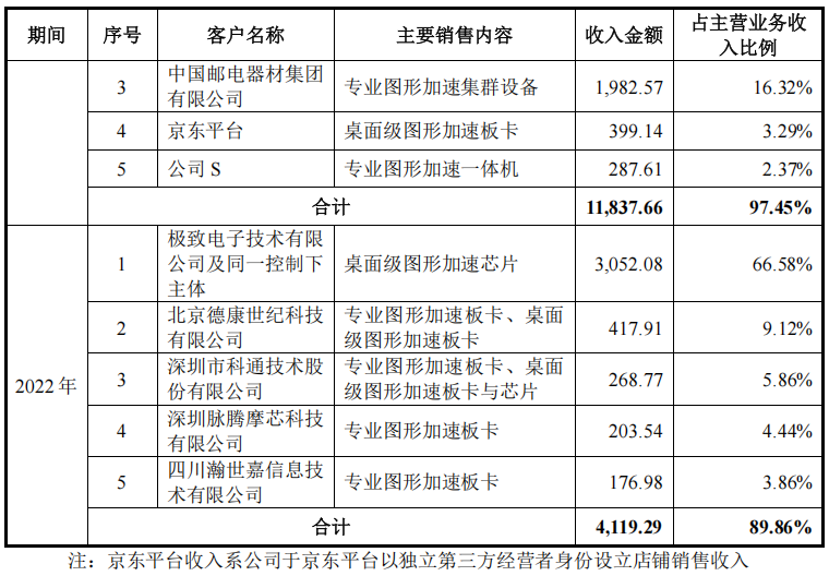 2022年,摩尔线程主要销售产品为专业图形加速板卡与桌面级图形加速板卡及芯片。由于此时仍是摩尔线程设立初期,因此主要参照国际 GPU 厂商销售模式通过经销商销售加速卡产品,其中极致电子技术有限公司为摩尔线程核心经销商,故摩尔线程2022年对其销售占比超过 50%。