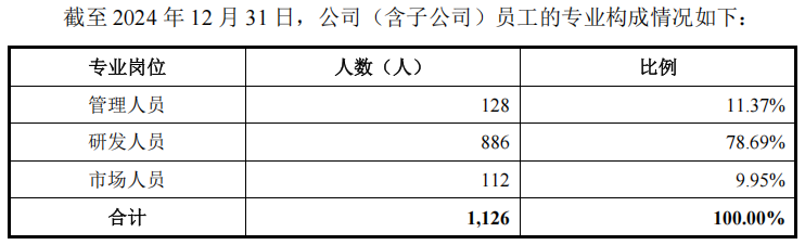截至2024年12月31日,摩尔线程(含子公司)员工人数为 1,126 人,其中研发人员共886 人,占员工总数的78.69%。