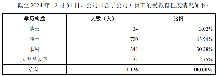 从员工的受教育程度来看,截至2024年12月31日,摩尔线程本科及以上学历的员工占比高达97.25%。