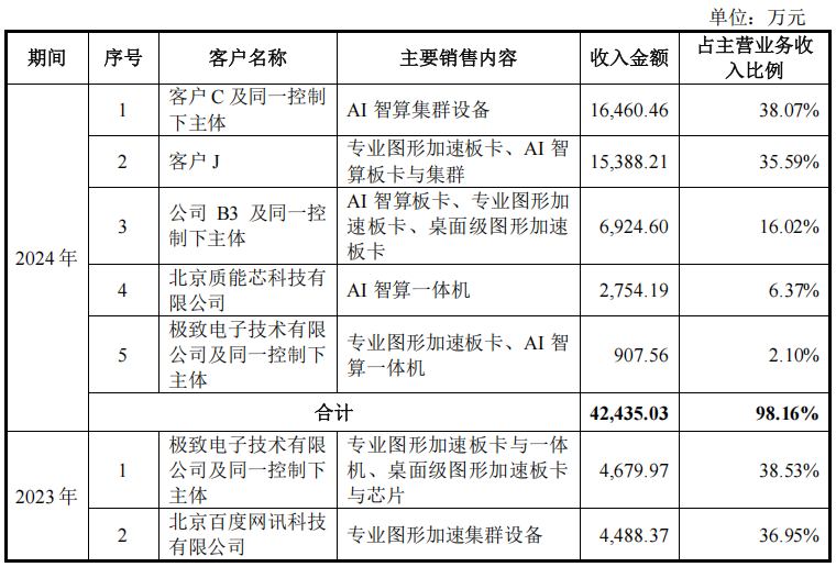 2023年至2024年,摩尔线程产品性能指标逐步提升、产品体系更为完善,主要销售产品中,除专业图形加速板卡与桌面级图形加速板卡外,AI 智算产品与专业图形加速集群设备销售占比较 2022 年度增长。因 AI 智算产品与专业图形加速集群设备单个合同金额较大,故摩尔线程2023 年与 2024 年向前五大客户销售占比维持较高水平。