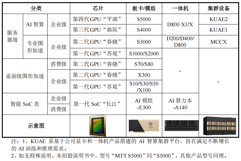 其中,AI智算产品包括:基于第四代GPU“平湖”的S5000板卡/模组;基于第三代GPU“曲院”的S4000板卡/模组;D800 X1/X一体机(D800 X1一体机集成了 8 张 MTT S4000 高性能 GPU加速卡);支持千卡互联的第一代超大规模智算融合中心产品KUAE1(夸娥1),支持万卡互联第二代超大规模智算融合中心产品KUAE2(夸娥2)。