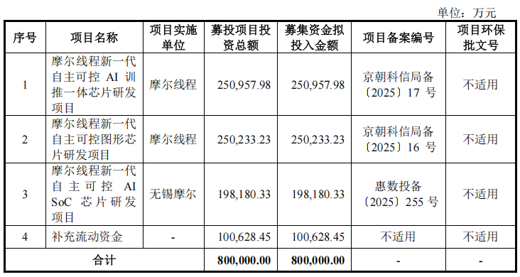 摩尔线程此次科创板IPO,拟募资80亿元,主要应用于摩尔线程新一代自主可控 AI 训推一体芯片研发项目、摩尔线程新一代自主可控图形芯片研发项目、摩尔线程新一代自主可控 AI SoC 芯片研发项目及补充流动资金。