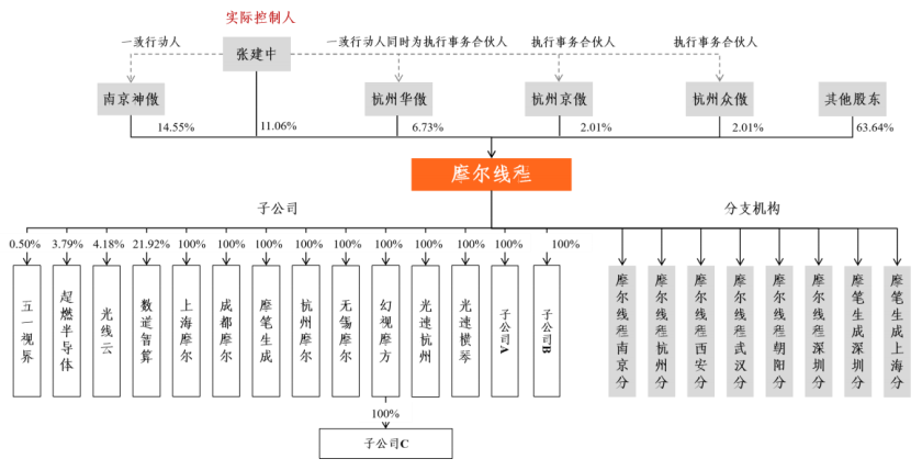 截至本招股说明书签署日,摩尔线程创始人、董事长兼总经理张建中先生直接持有公司 11.06%股份,同时与持股平台南京神傲、杭州华傲签署一致行动人协议,并担任杭州华傲、杭州众傲及杭州京傲三家员工持股平台的执行事务合伙人,合计控制发行人 36.36%的股份,为公司实际控制人。