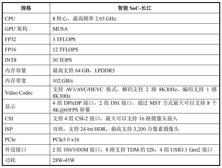 需要指出的是,摩尔线程第一代SoC“长江”集成了“全功能 GPU + CPU + NPU +VPU”等异构算力单元的片上系统芯片,拥有8核CPU,主频2.65GHz,GPU是MUSA架构,INT8算力达50TOPS。