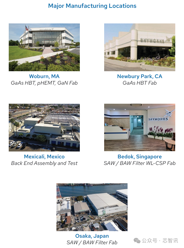 射频器件及无线通信芯片大厂Skyworks,其GaAs HBT晶圆厂位于美国加利福尼亚州纽伯里帕克;其GaAs HBT、pHEMT、GaN晶圆厂位于美国马萨诸塞州Woburn;其SAW/ BAW Filter WL-CSP 晶圆厂位于新加坡Bedok;在日本大阪也拥有SAW/ BAW Filter晶圆厂。Skyworks的后端封测厂则是在墨西哥Mexicali。
