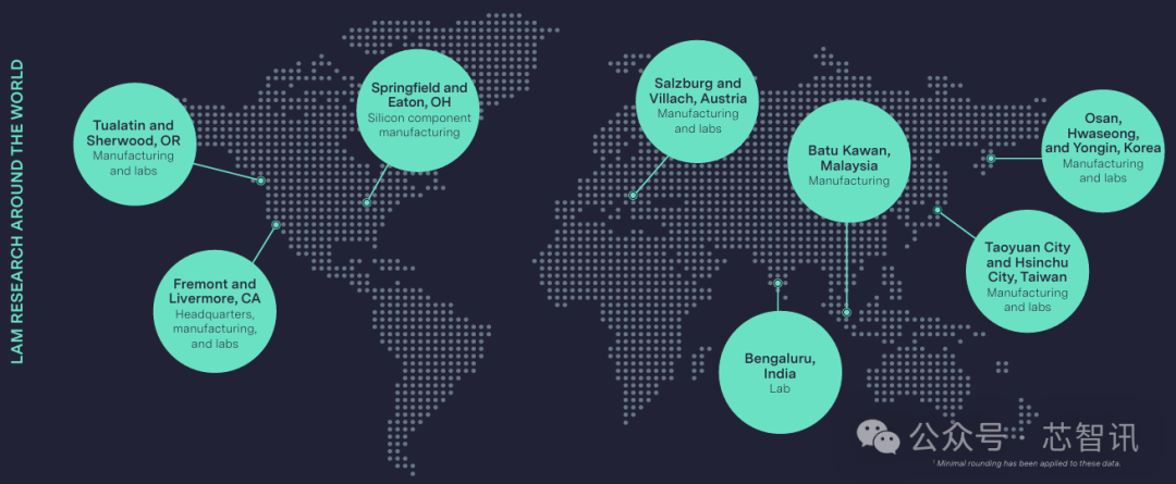 根据芯智讯查询泛林集团2023年度ESG报告了解到,泛林集团在美国加利福尼亚州费利蒙(Fremont)和利弗莫尔(Livermore)设有制造设施,在俄勒冈州图阿拉丁(Tualatin)和舍伍德(Sherwood)设有制造设施,在俄亥俄州伊顿(Eaton)和斯普林菲尔德(Springfield)都设有制造设施。另外,在韩国华城、奥地利菲拉赫(Villach)、中国台湾、马来西亚巴图卡万(Batu Kawan)也设有制造设施。