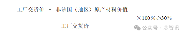 “从价百分比”标准,是指在某一国家(地区)对非该国(地区)原产材料进行制造、加工后的增值部分超过了所得货物价值的30%。用公式表示如下: