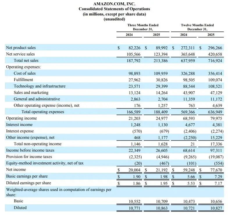 亚马逊2025年第四季营收同比增长14%至2,134亿美元,略高于分析师预期的2,113.3亿美元;每股收益为1.95美元,高于去年同期的1.86美元,低于分析师预期的1.97美元。