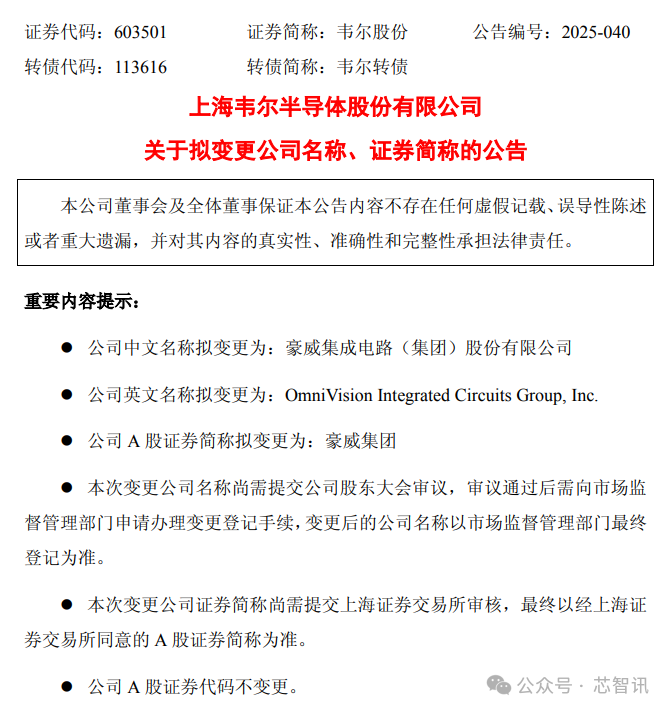 5月19日晚间,国内半导体龙头公司韦尔股份发布公告称,公司拟将公司名称从“上海韦尔半导体股份有限公司”变更为“豪威集成电路(集团)股份有限公司”,证券简称从“韦尔股份”变更为“豪威集团”,证券代码保持“603501”不变。