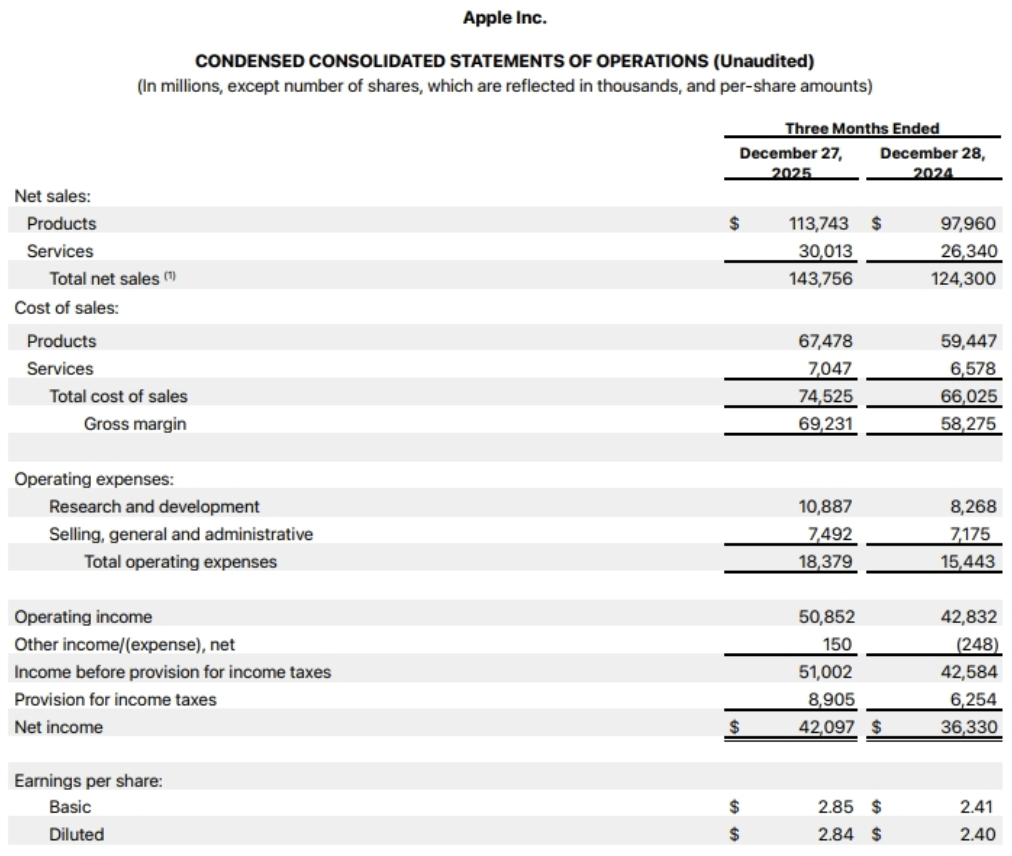 当地时间1月29日,苹果公司公布了截至2025年12月27日的2026财年第一财季财报,营业收入达1438亿美元,同比增长约16%;净利润由上一财年同期的363.3亿美元增至421亿美元。稀释每股收益2.84美元,同比增长19%,优于市场预期。推动苹果盘后股价上涨约3%。