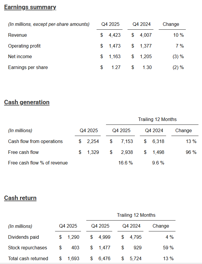 2025年度,德州仪器的经营活动现金流为72亿美元,再次凸显了我们商业模式的优势、产品组合的质量以及300毫米生产带来的好处。同期自由现金流为29亿美元。2025年,德州仪器在研发和销售、管理及行政费用方面投资了39 亿美元,在资本支出方面投资了46 亿美元,并向股东返还了65 亿美元。