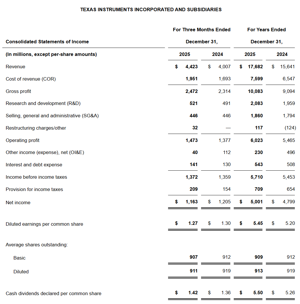 根据财报显示,德州仪器2025年第四季营收同比增长10%至44.2亿美元,环比下滑7%,略低市场预期的44.4亿美元,主要受智能手机、PC及平板电脑等消费类电子产品需求疲软拖累;净利润同比下滑3%至11.6亿美元;每股收益由去年同期的1.30美元降至1.27美元,同比下滑2%。