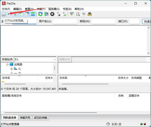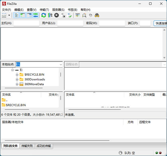 FileZilla 默认安装完成后会自动启动,它的主界面如下图所示: