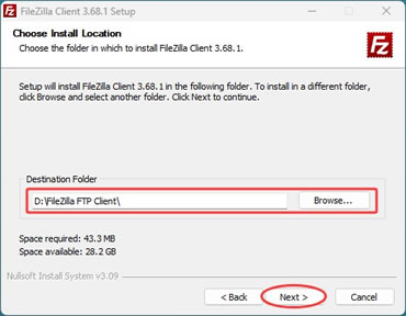 下图中,建议将 FileZilla 的安装路径手动修改到非系统盘,我这里因为之前安装过 FileZilla,所以默认是 D 盘,如果你们默认是 C 盘,建议手动修改一下: