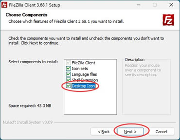 下图中,Desktop Icon 默认是没有勾选的,建议勾选上,这样安装完成后会在桌面上看到 FileZilla 的图标。然后点击 Next: