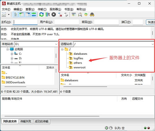 首先可以熟悉一下 FileZilla 的窗口布局: