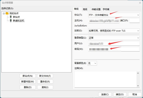 主机处输入服务器的地址,用户处输入用户名,密码处输入用户密码,其他保持默认: