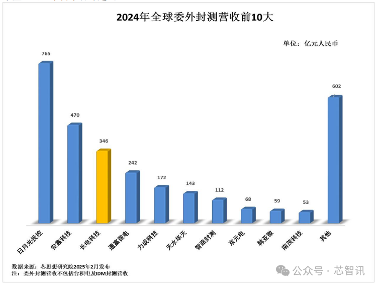 根据芯思想研究院(ChipInsights)发布的 2024 年全球委外封测(OSAT)榜单显示,长电科技以预估 346 亿元营收在全球前十大 OSAT 厂商中排名第三,中国大陆第一。