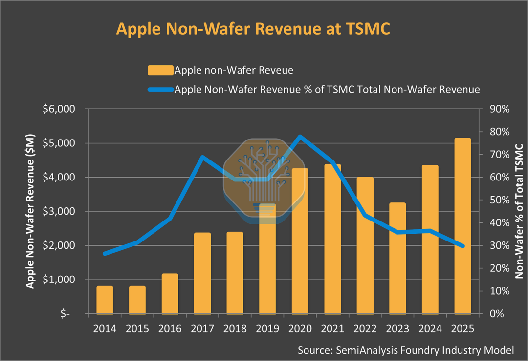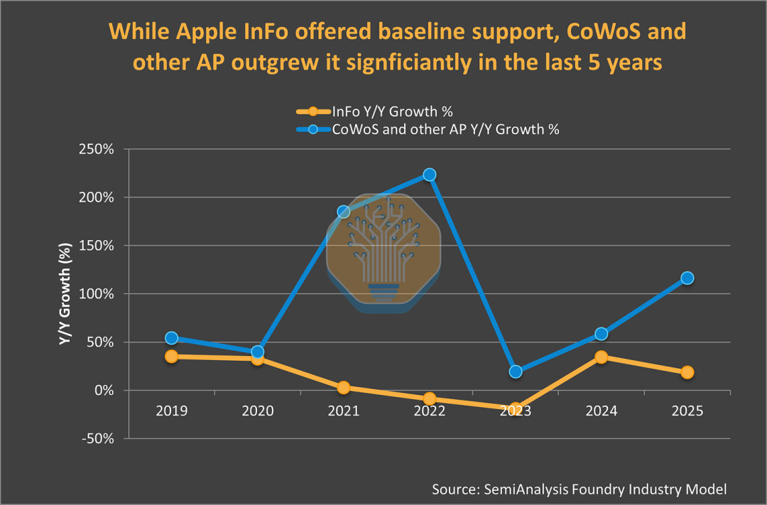 虽然苹果是首个大规模采用台积电先进封装技术的客户,其为台积电InFO先进封装服务带来的收入从 2018 年的 18 亿美元增长到 2024 年的 35 亿美元以上,这完全得益于苹果 A 系列和 M 系列芯片的推动。但台积电的 AI 封装平台 CoWoS 已经超越了它。在英伟达和 AMD 的强劲需求推动下,CoWoS 先进封装为台积电带来的收入在 2025 年达到了 96 亿美元,是 InFO 的 2.5 倍。