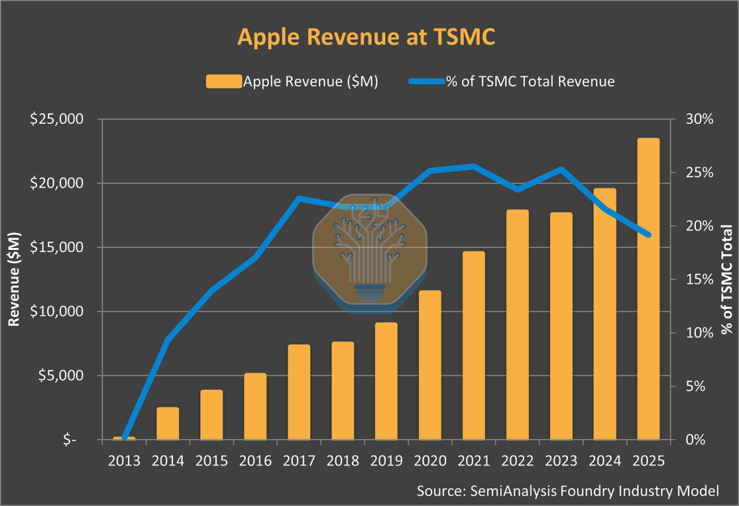 根据半导体研究机构Semianalysis的报告,苹果自2014年起通过早期承诺、大规模下单台积电的新制程之后,随即成为台积电全球最重要的单一大客户。这份关系的建立并非偶然,而是来自苹果愿意承担早期高昂成本、资助良率提升(Yield Improvements),并将其年度产品周期与台积电的技术蓝图(Roadmap)紧密结合所形成的。这种策略让台积电得以获得稳定的研发资金,进而超越竞争对手,巩固其在领先制程中的主导地位。