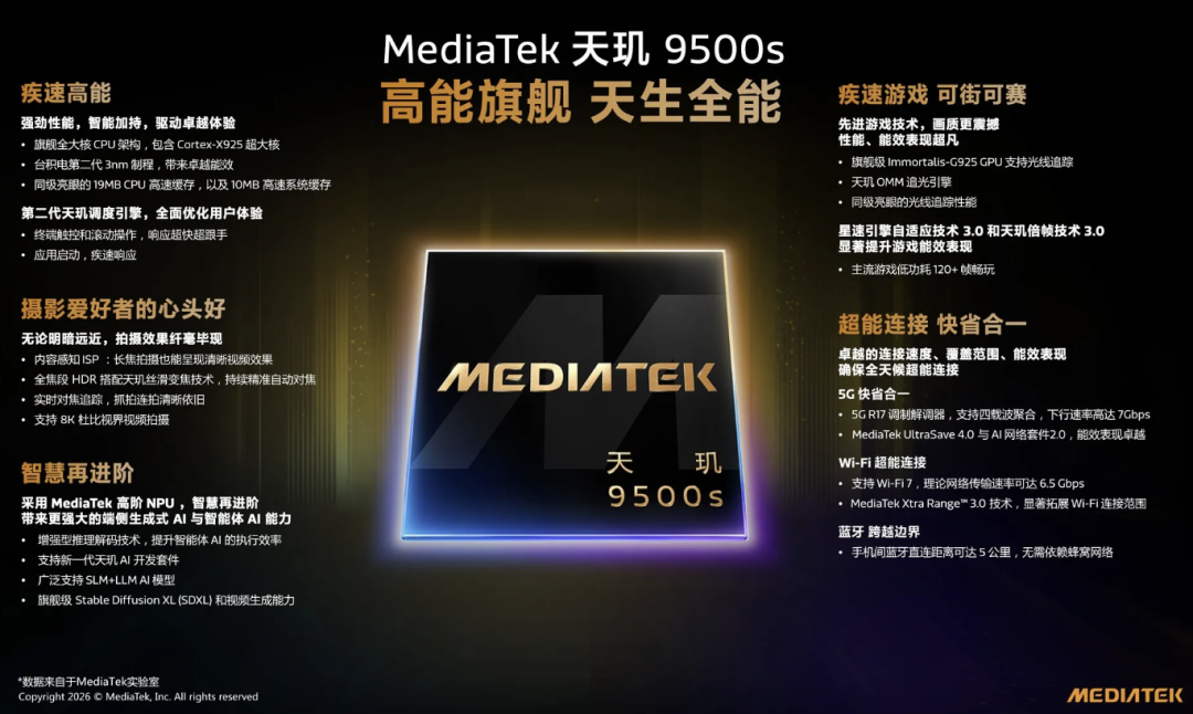 天玑 9500s 搭载Immortalis-G925 GPU ,提供重载硬核手游满帧、沉浸式的畅游体验,满足游戏发烧友、电竞选手对性能的期待。天玑 9500s支持先进的光线追踪技术,天玑 OMM 追光引擎能够高效渲染图形,大幅提升游戏画面的真实感和精细度,带来主机级的环境光照和反射效果。此外,借助天玑星速引擎的自适应技术 3.0(MAGT 3.0)和天玑倍帧技术 3.0(MFRC 3.0),天玑9500s可显著提高主流游戏的能效表现,延长终端的续航时间。该芯片还支持165超高帧游戏,助力玩家体验快人一步。