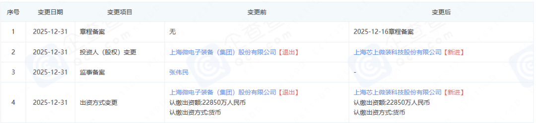 近日,上海威耀实业有限公司(简称“威耀实业”)发生股东重大变更。国产光刻机厂商上海微电子装备(集团)股份有限公司(简称“上海微电子”)原本是威耀实业是100%控股股东,但现在已经全面退出,上海芯上微装科技股份有限公司(简称“芯上微装”)则成了威耀实业的100%控股股东,认缴出资额同样为2.285亿元。