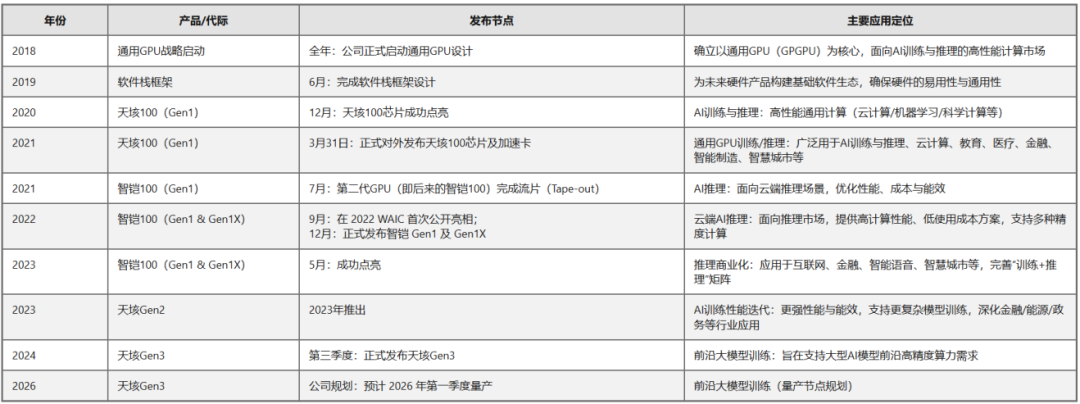 在天垓100打开训练与通用计算场景后,天数智芯迅速补齐推理侧产品:智铠100在2021年7月完成流片,2022年9月在世界人工智能大会(WAIC)首次公开亮相,2022年12月发布智铠Gen 1与Gen 1X,并在2023年2月实现量产,从而形成训练与推理两条产品线的闭环。此后训练侧继续迭代:第二代训练产品在2023年推出并于当年第四季度实现量产;第三代训练产品在2024年第三季度发布,并给出2026年第一季度量产的规划节奏。