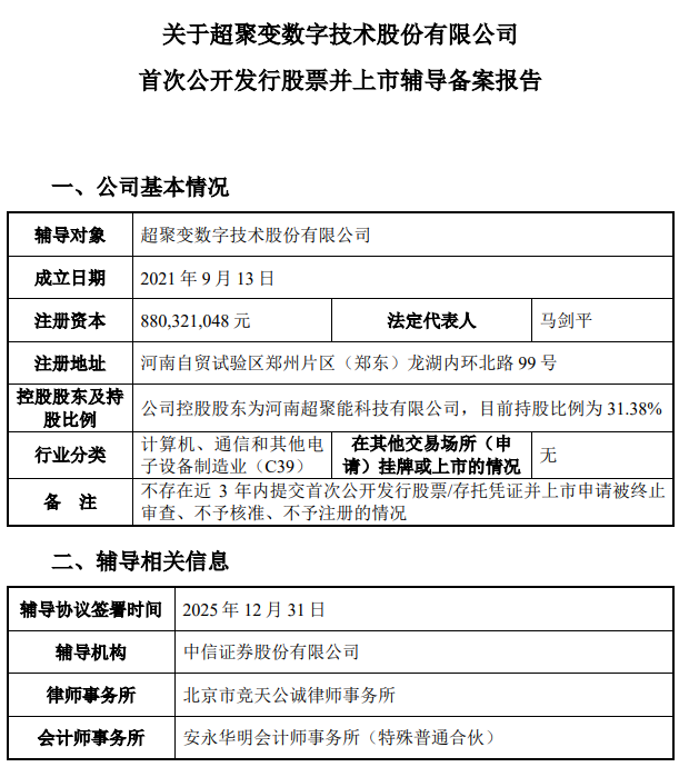 据证监会官网显示,国内服务器大厂超聚变数字技术股份有限公司(以下简称“超聚变”)于2026年1月6日正式启动上市辅导,中信证券担任辅导机构。