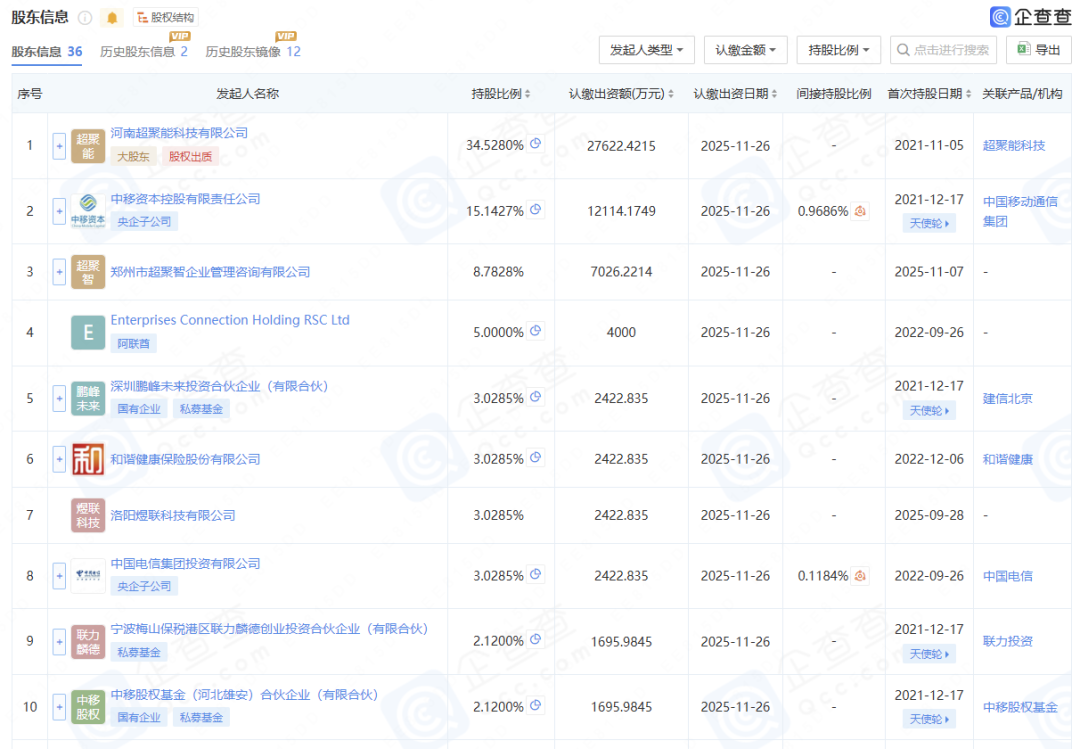 企查查资料显示,超聚变目前共有36名股东,其第一大股东为持股34.5280%的河南超聚能科技有限公司。其他股东还包括中移资本控股有限责任公司、中国电信集团投资有限公司、中国互联网投资基金(有限合伙)、中国国有企业结构调整基金二期股份有限公司等。