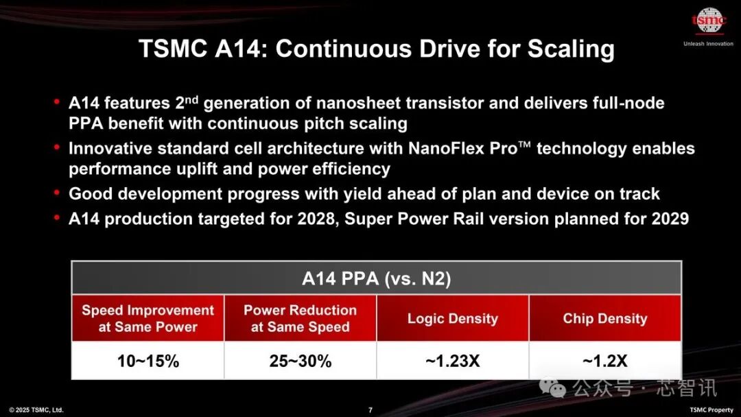 具体指标方面,与今年稍晚量产的N2制程相比,A14制程在相同功耗下,速度可提升15%,或在相同速度下,功耗可降低30%,逻辑密度增加超过20%。结合台积电纳米片晶体管设计协同最佳化经验,将TSMC NanoFlex标准单元构架发展成NanoFlex Pro,以实现更佳性能、能效和设计灵活性。