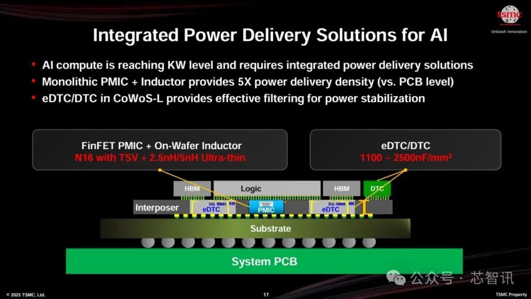 台积电强调,为完备其逻辑技术的极致运算能力和效率,提供了许多解决方案,其中包含运用了紧凑型通用光子引擎(COUPETM)技术的硅光子整合、用于HBM4的N12和N3逻辑基础裸晶,以及用于AI的新型整合型电压调节器(Integrated Voltage Regulator,IVR),与电路板上的独立电源管理芯片相比,其具备5倍的垂直功率密度传输。