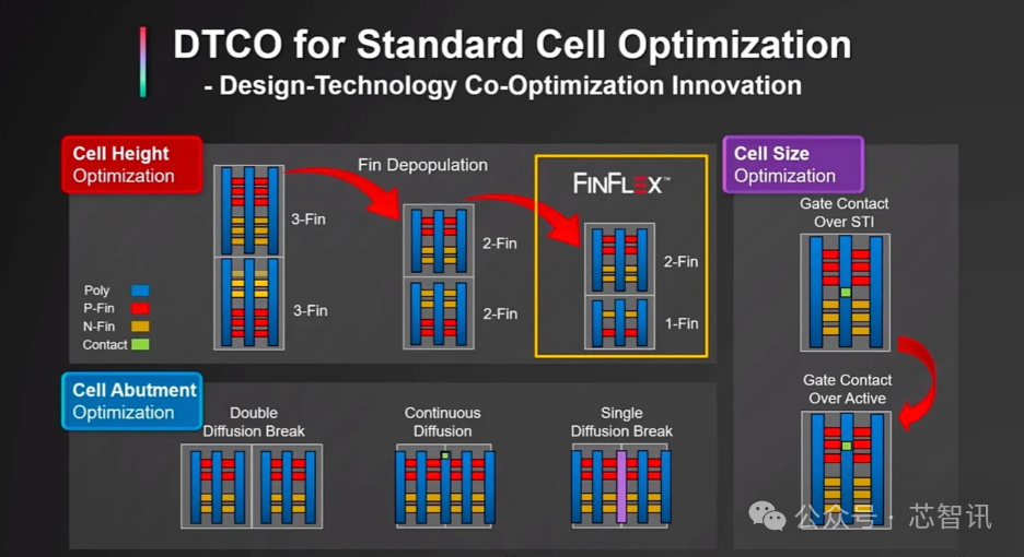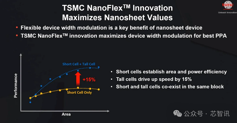 NanoFLEX晶体管架构:NanoFLEX 基于 GAA 纳米片晶体管的演进,引入了灵活的通道堆叠技术,允许在同一设计中集成不同尺寸和形状的纳米片。这使得特定功能(逻辑、内存、I/O)的调整成为可能,可以根据模块的性能、功耗或面积进行优化,从而增强晶体管级别的定制化和设计自由度。