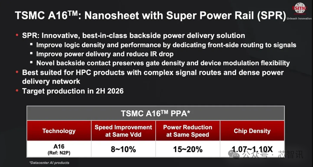 超级电轨(SPR)技术:SPR 实现了背面供电网络,将电源轨从晶圆正面移至背面。这显著减少了布线拥塞和电源噪声,同时释放了金属层,从而提高了信号效率。这标志着台积电首次在量产逻辑节点中引入背面供电技术,实现了电源架构的真正跨越。