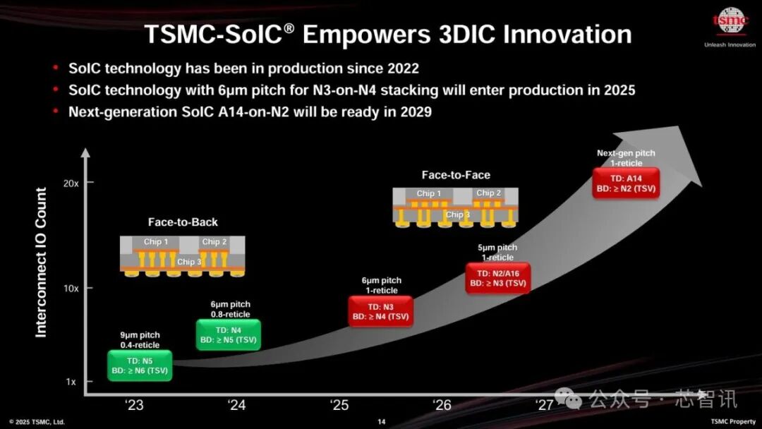 其中,在3D集成方面,SoIC-P采用微凸块技术,可将间距降至 16 微米。使用无凸块技术(SoIC-X),可以实现几微米的间距。台积电最初采用 9 微米工艺,目前已投入 6 微米量产,并将进一步改进,从而实现类似单片的集成密度。