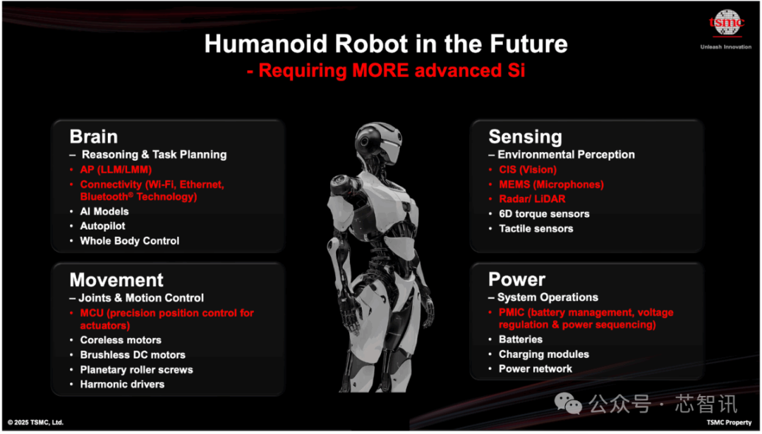 虽然自动驾驶汽车备受关注,但人形机器人的需求也备受关注。台积电提供了下图,以说明所需的大量先进硅片。而将所有这些芯片集成到高密度、高能效的封装中的能力也至关重要。
