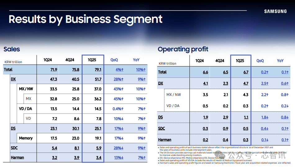 负责半导体业务的DS部门,在HBM 销售下滑等原因的冲击下,一季度营收环比下滑17%(同比增长9%)至25.1万亿韩元,营业利润相比上季(1.8亿韩元)减少到了1.1万亿韩元。