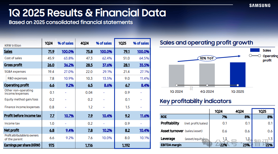 4月30日消息,韩国三星电子公布了2025年第一季财报,营收同比增长10%至79.14万亿韩元,创下单季历史新高;尽管负责半导体业务的DS部门面临季度营收下滑的不利因素,三星电子营业利润同比增长1.2%至6.7万亿韩元,环比增长3.1%;净利润达8.22万亿韩元,同比增长21.7%,高于市场预期5.58万亿韩元。