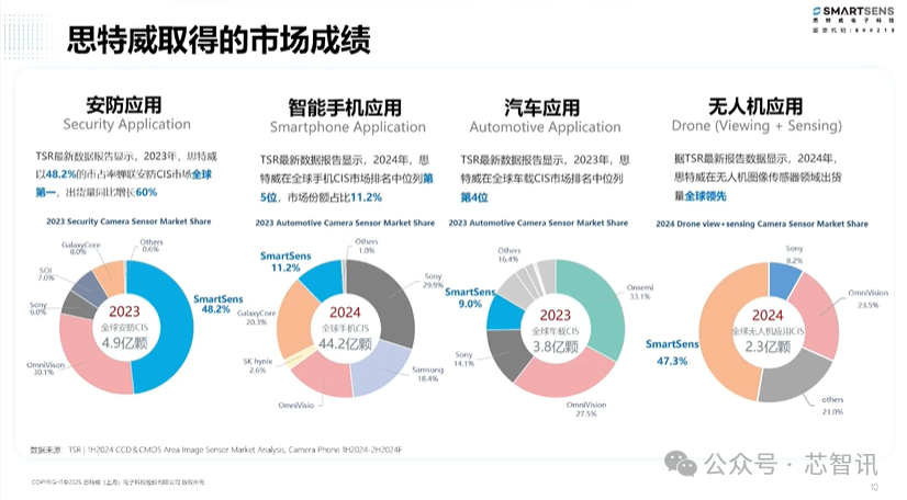 据宗翔介绍,作为国内知名的CMOS图像传感器厂商,思特威自2014年推出第一款芯片,2017年就成功做到了安防CMOS图像传感器市场第一,并且一直保持到了现在,2024年安防市场占有率超过50%。在智能手机市场,思特威自2021年开始进入,到2024年已经在全球市场排名第5位,2024年市场份额为11.2%,预计今年还会有比较大的涨幅。