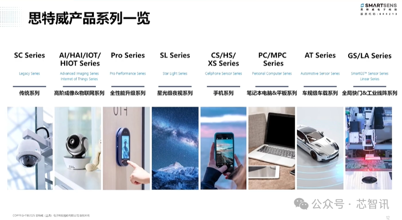 从整个产品线来看,思特威主要是根据不同的应用市场来做分类,所以有很多系列,包括传统系列、物联网系列、AI系列、星光夜视系列、手机系列、PC系列、车规级车载系列、全局快门&工业线阵系列等。