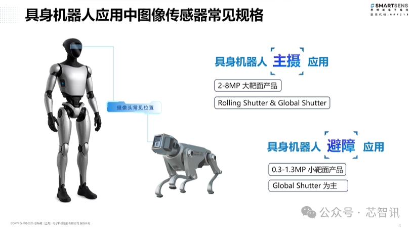 在宗翔看来,具身智能机器人在实际的工作中需要不断与现实世界进行交互,那么通常就需要清晰、准确、高效、稳定的视觉感知能力,是帮助机器人完成避障、定位等现实交互的关键,如同机器人的“电子眼”。而具身智能机器人所需的图像传感器的常见规格有两大类,一类是主摄应用,通常是200-800万项目的大尺寸的图像传感器;另一类则是主要面向避障应用的30-130万像素的小尺寸的全局快门传感器。